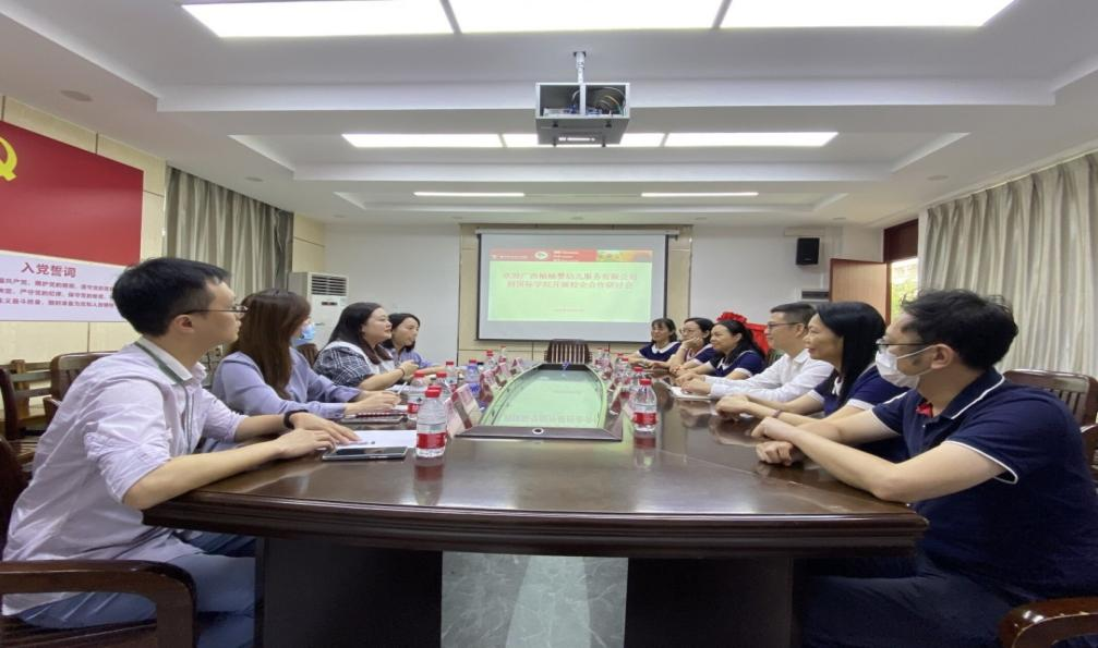2022年10月25日,广西睿迪柚柚托育集团总经理陈枫带队一行5人到国际学院开展产教融合、校企合作洽谈并为实习实训基地揭牌。国际学院书记、院长张治中,副院长伍淑君,以及学前教育专业教师参加交流和揭牌仪式。