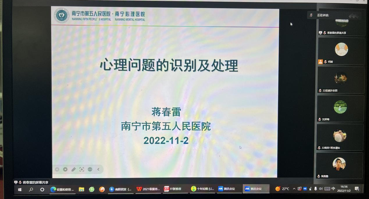 11月2日下午,国际学院特邀南宁市第五人民医院心理健康科主任、心理学副教授、国家心理治疗师蒋春雷为同学们送上一堂精彩的线上心理健康教育讲座。本次讲座旨在切实做好2022级新生的心理关爱及服务工作,帮助学生树立积极向上的健康心态,普及心理健康知识。