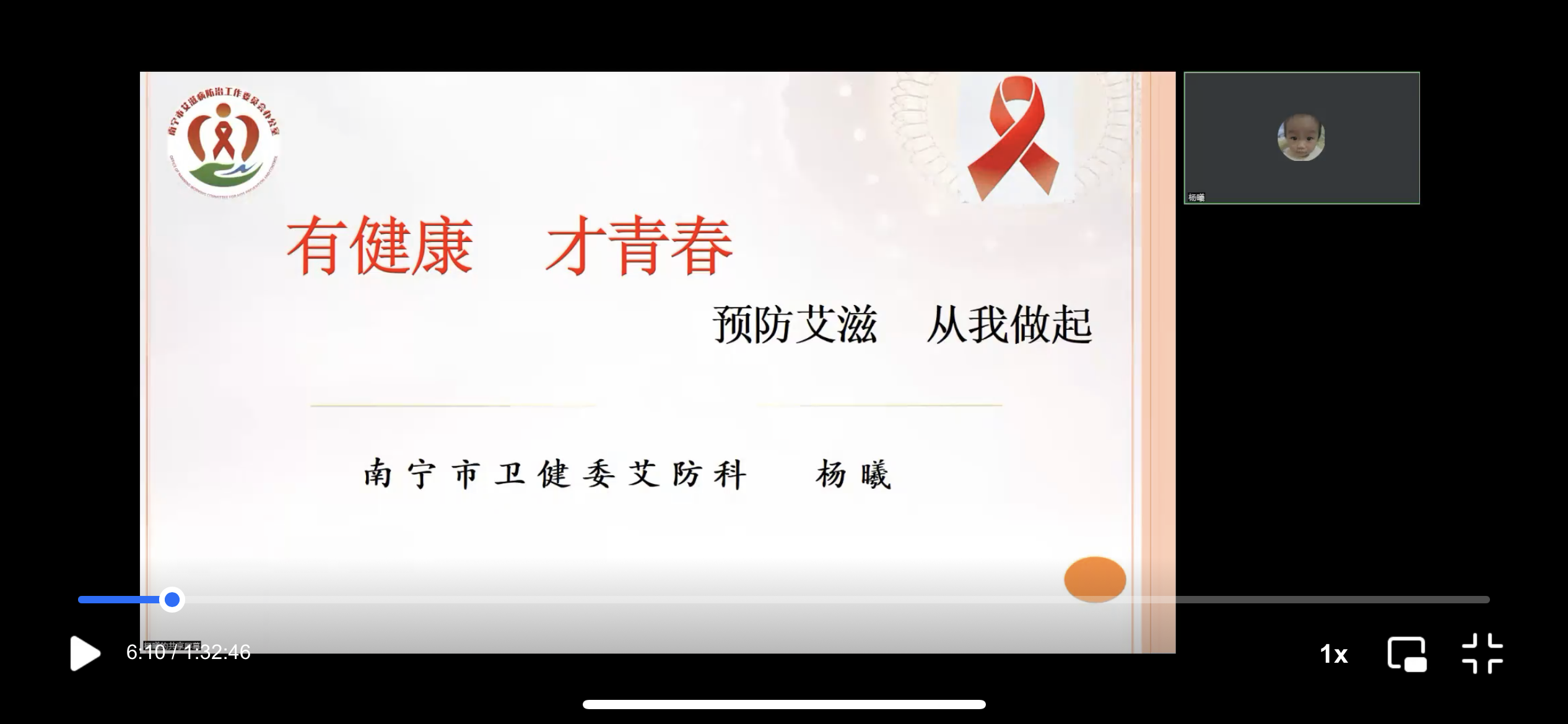 为切实关注我院新生的身体健康,增强学生防艾知识和保护意识,11月1日下午,我院特邀南宁市疾控中心杨曦副主任医师,通过线上形式给我院2022级全体新生共300余人开展预防艾滋病教育主题讲座。本次讲座旨在帮助新生大学生认识艾滋病、了解艾滋病,做好预防艾滋病知识。