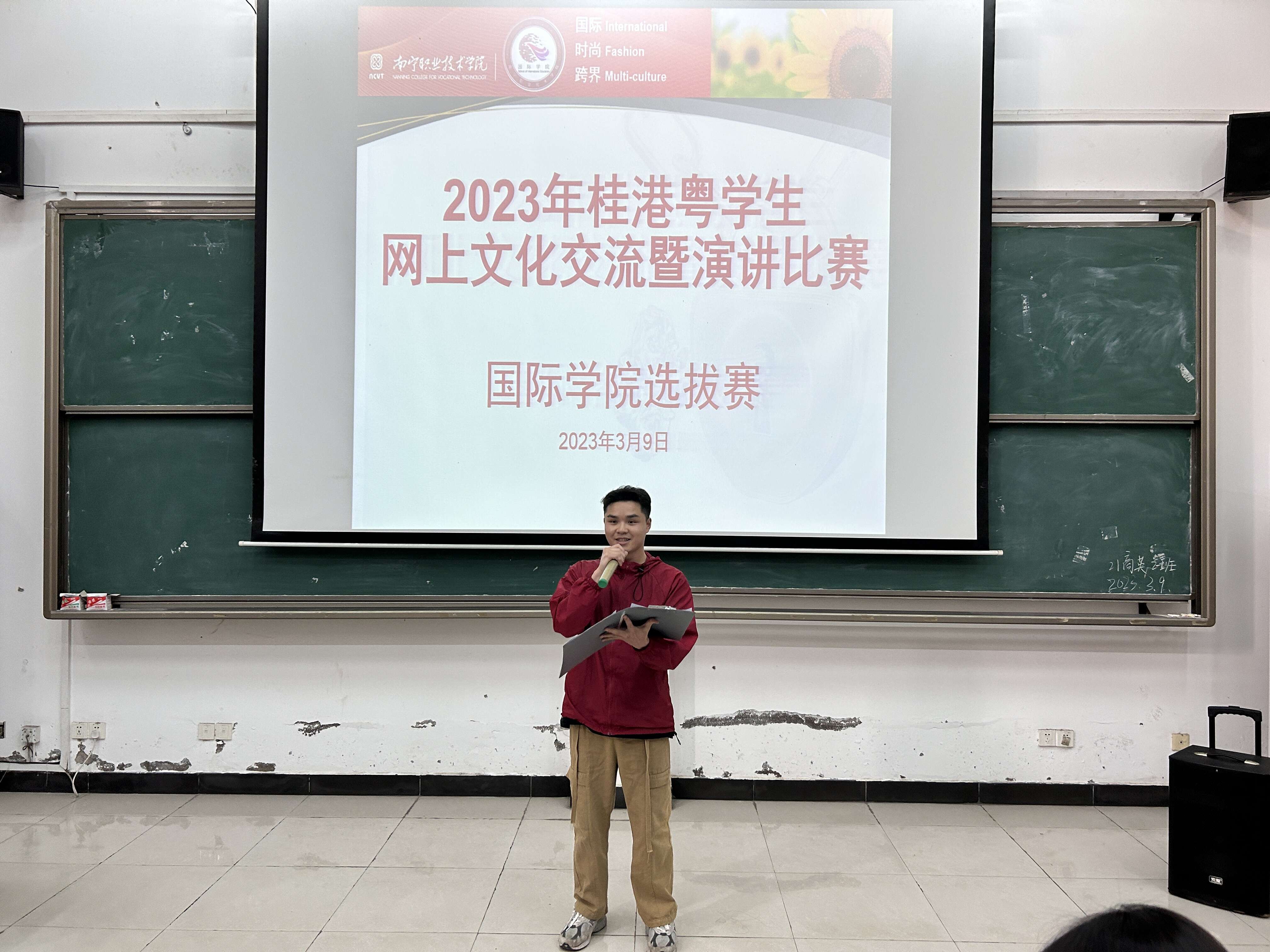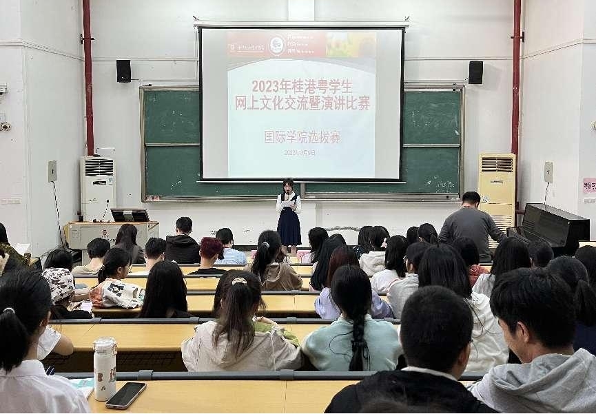 3月9日下午,国际学院在学校四阶梯教室举行桂港粤学生网上文化交流暨演讲比赛院内选拔赛,我院学生管理中心全体教师到场担任比赛评委。本次选拔赛旨在提供学生锻炼自我,展示自我的平台,加深学生对桂港两地文化的认识。