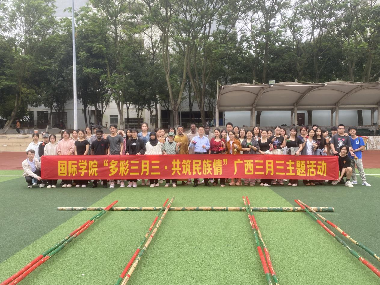 4月7日,国际学院在学校田径场组织举办“多彩三月三·共筑民族情”主题活动,中外师生共同欢度广西壮族的传统节日——三月三。学院党委副书记林漫森、学生管理中心老师们和中外学生都参与到活动中,深度体验了一场富有民族特色的文化盛宴。