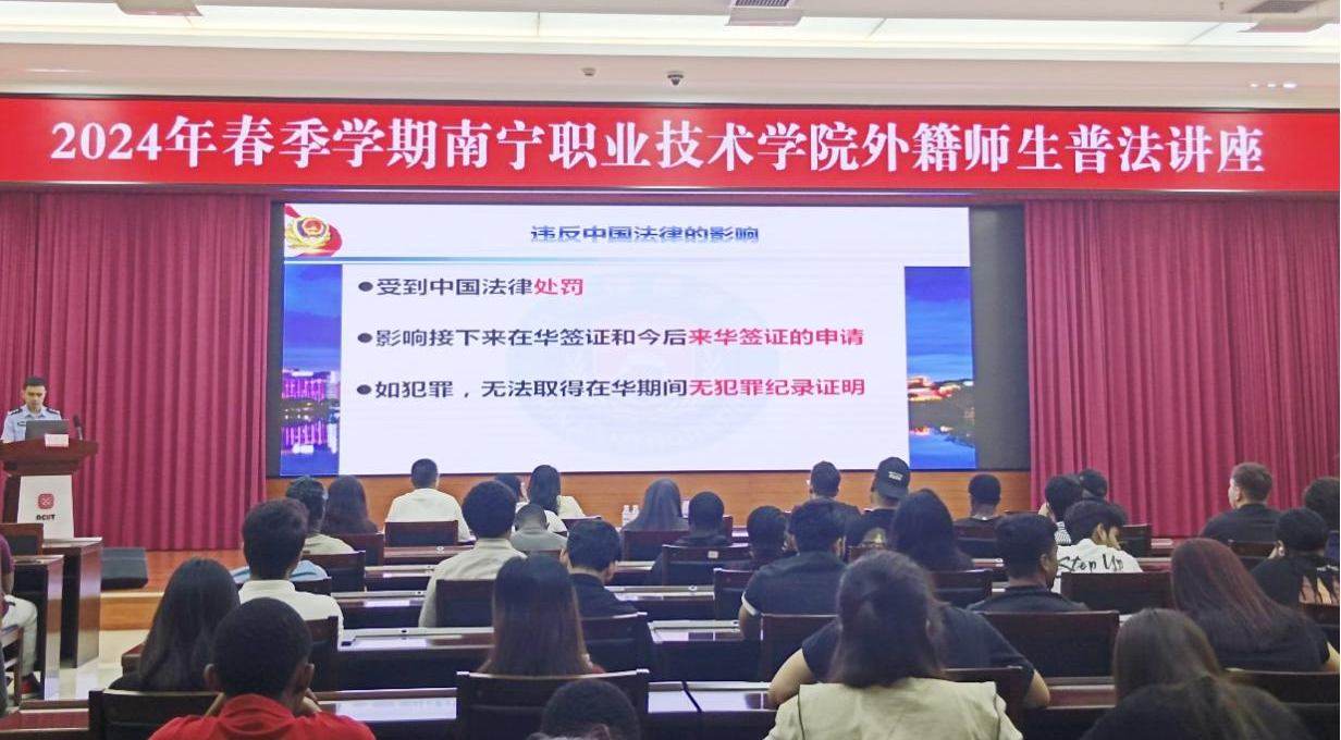 2024年4月23日,国际学院组织举行外籍师生普法讲座,邀请南宁市公安局出入境管理支队李思丹警官等嘉宾作为主讲人,以提升外籍师生学法、知法、懂法、守法的意识。学院党委副书记林漫森、外事干事、留学生辅导员及全院留学生参与了此次讲座。