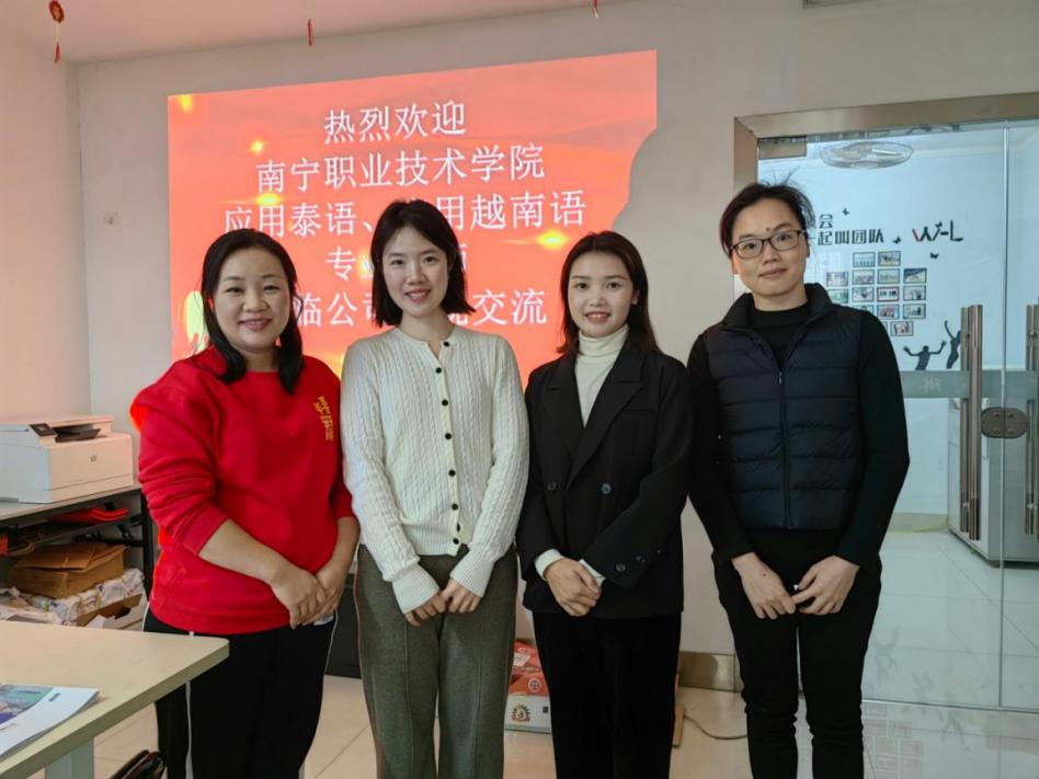 4月13日,国际学院应用泰语、应用越南语团队走访了南宁威琳如译翻译有限公司,以更好了解企业用人需求,拓宽毕业生就业渠道。