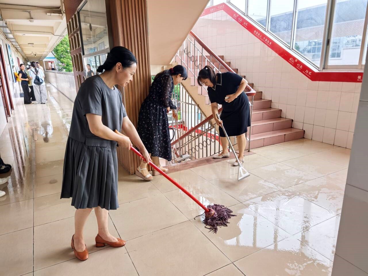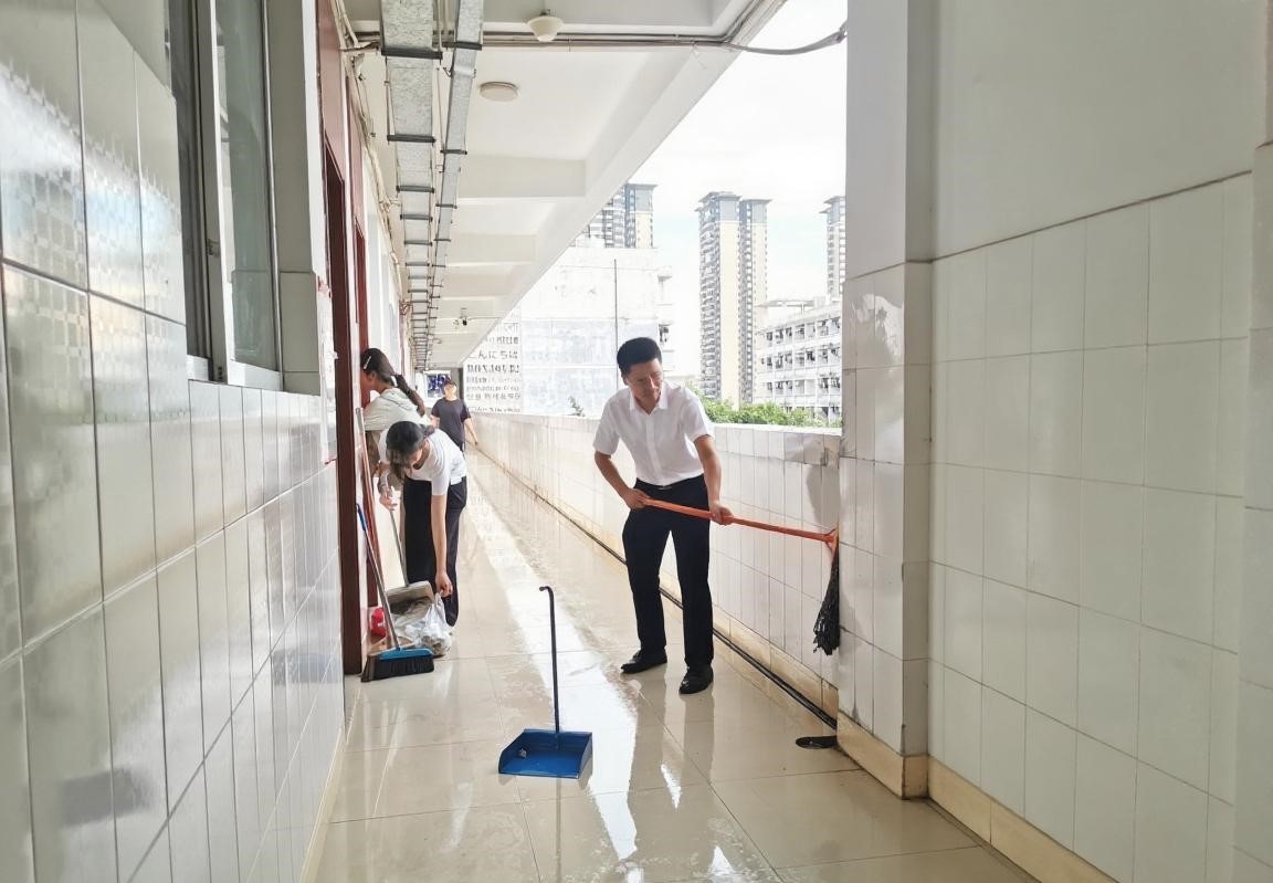 行动迅速,师生携手显担当。大扫除过程中,师生们热情高涨、分工协作。在公共区域,大家对走廊、过道进行了细致清扫,将地面杂物、灰尘一一清除,重点对阳台、楼道、绿化带等易积水的卫生死角进行“地毯式”排查与清理;对于卫生间,重点清理了卫生死角,确保环境整洁无异味。在各办公室,教职工们认真擦拭办公桌椅、门窗玻璃,整理文件资料,让办公环境焕然一新。老师们不仅指挥协调,更带头弯腰清理垃圾、翻盆倒罐清除积水,用实际行动诠释了责任与担当。学生们也充分发挥劳动积极性,主动承担起责任区域的清洁任务,展现出良好的精神风貌。