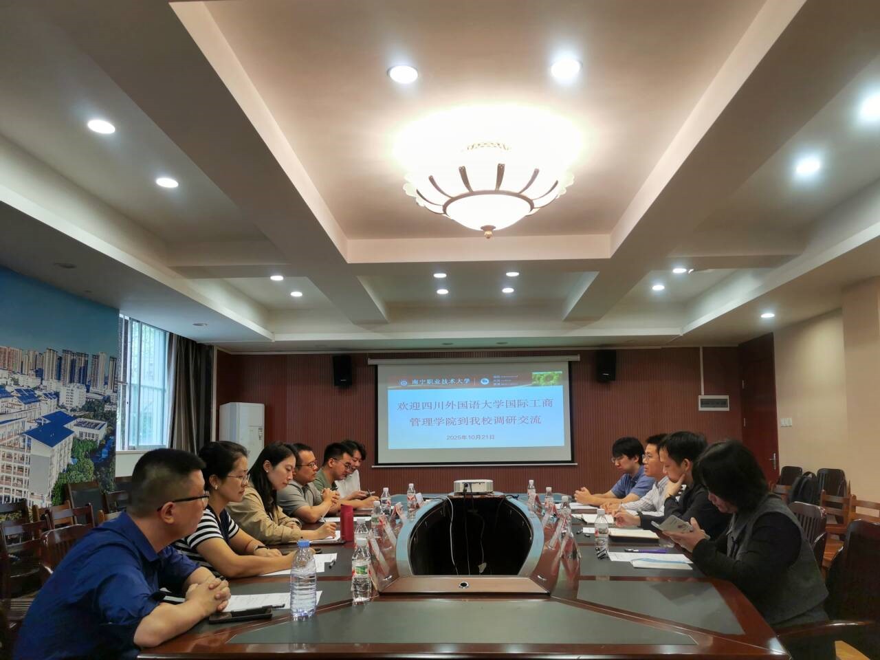 10月21日,四川外国语大学国际工商管理学院党总支书记王婷、院长代彬等一行到我院调研交流。我院党委书记彭敏、副院长李正海,数字经济学院跨境电商专业负责人兰青叶等参加交流活动,合作企业颜值立方(厦门)电子商务集团有限公司经理王子瑜参加调研。