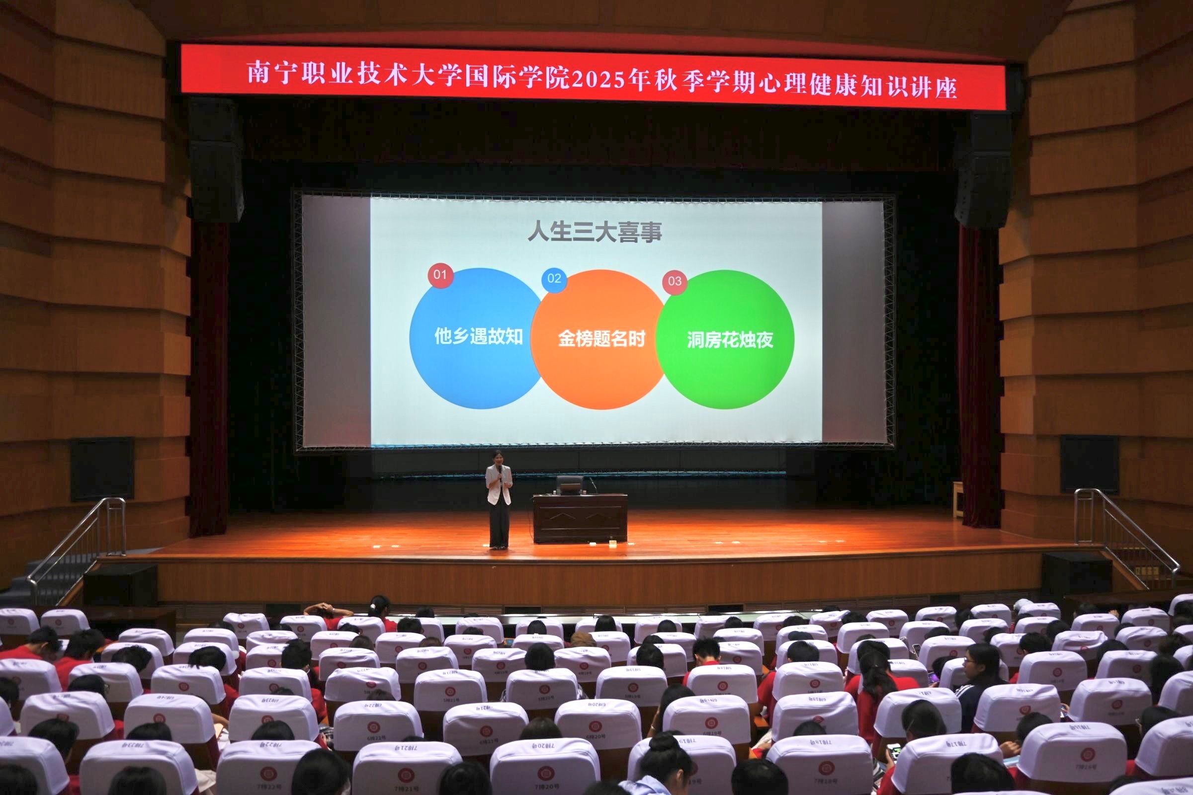 为助力2025级新生更好地适应大学生活、提升心理素质,国际学院于10月21日在学校会议中心1号厅举办了心理健康知识讲座。此次讲座特别邀请了广西财经学院心理健康教育与咨询中心覃梅芳副教授担任主讲,2025级全体新生参与了本次活动。