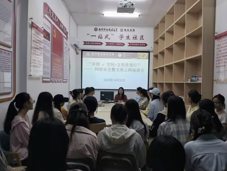 10月25日,国际学院在“一站式”学生社区开展了“清朗e空间·文明伴我行”网络安全暨文明上网座谈会,以进一步提升学生的网络安全意识,倡导文明上网的良好风尚。会议由李婵老师主讲,学院各班班长和宣传委员参加座谈。