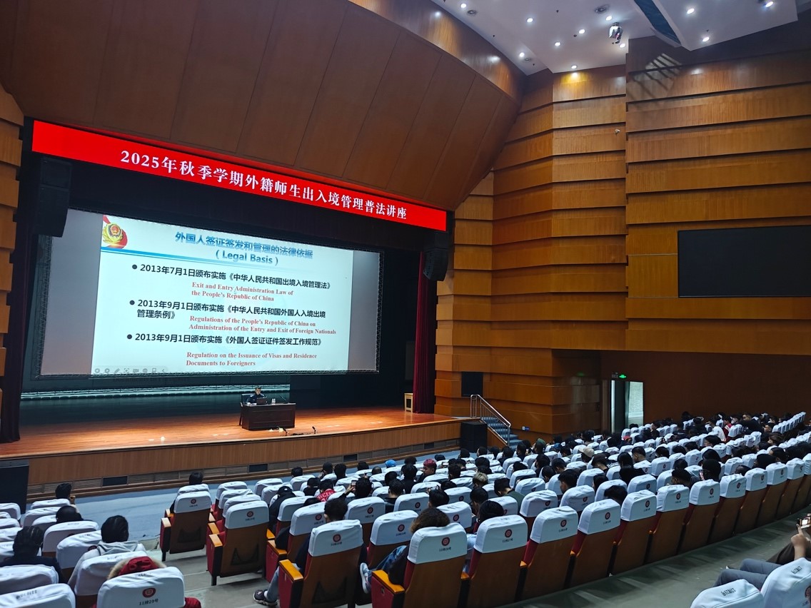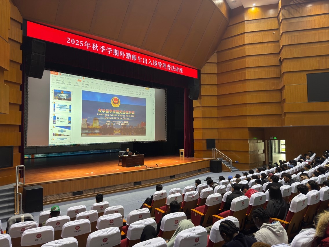 为进一步增强外籍师生学法、知法、懂法、守法的意识,2025年11月4日,国际学院在会议中心一号厅举办了2025年秋季学期外籍师生出入境管理普法讲座,特邀南宁市公安局出入境管理支队吴思宸警官担任主讲,国际学院党委副书记郑思、留学生辅导员以及来自国际学院、智能制造学院的240名留学生共同参加本次活动。