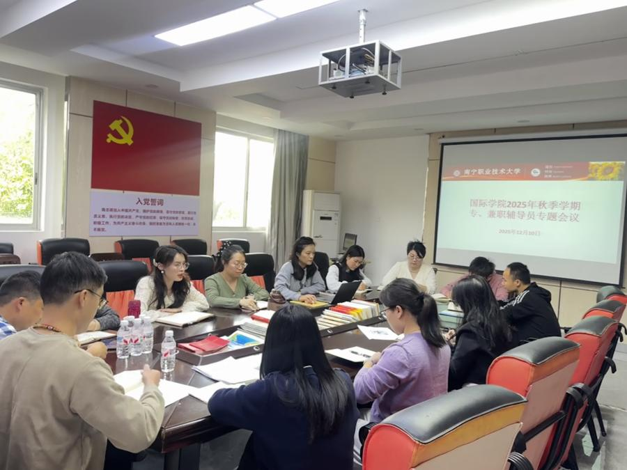 12月10日,国际学院在1教301会议室召开专兼职辅导员专题工作会议。学院党委副书记郑思、全体专兼职辅导员参会,会议由学生服务中心主任陈宇婷主持。
