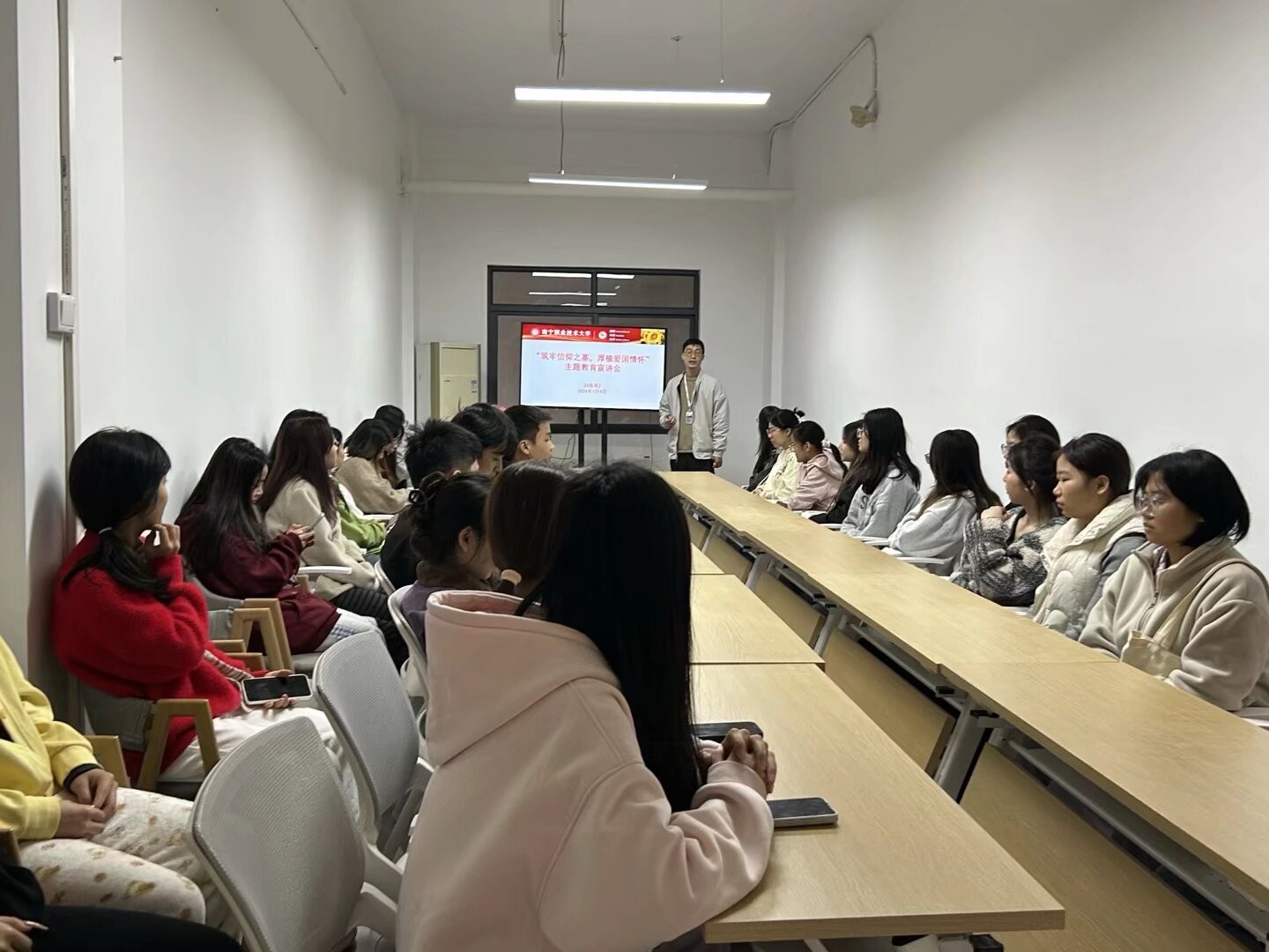 为深入学习领会新时代爱国主义精神的深刻内涵,引导青年学子坚定理想信念,强化使命担当,国际学院2024级商务英语2班于近日在学院“一站式”学生社区召开了“筑牢信仰之基,厚植爱国情怀”主题教育宣讲会。班级全体同学齐聚一堂,共同接受了一次深刻的思想洗礼与精神激励。