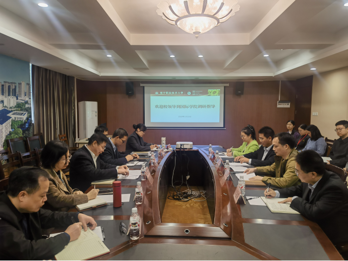 宾月景认真听取学院工作汇报,对国际学院在国际化人才培养、对外交流合作等方面取得的成绩给予充分肯定,并就专业建设、小语种人才培养、留学生管理、国际交流与合作等方面提出了指导意见。他指出,国际学院作为学校国际化办学的重要载体,要充分发挥“语言+”优势,为全校各专业国际化赋能,培养“语言+技术技能”的高端人才;要进一步优化专业布局,助力学校面向东盟开放办学;要加强教师队伍建设,加强国际交流与合作,扩大留学生规模。各职能部门要主动对接,精准施策,在经费支持、师资建设、实训升级等方面为学院发展提供有力保障,共同推动学校国际化办学水平再上新台阶,为学校新“双高”建设和职业本科建设注入更强动力。
