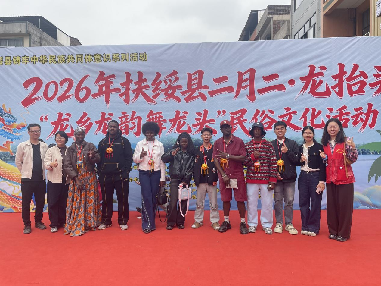 春龙抬首,万物复苏。3月21日,广西扶绥县龙头乡举办2026年二月二龙抬头暨“龙乡龙韵舞龙头”民俗文化活动。我校国际学院留学生应邀参加此次活动,与各族群众共赴这场传承三百余年的民俗盛会。46面迎宾鼓齐鸣,3条大龙从左江踏浪而来,25条手工编扎的草龙依次登场,留学生们置身其中,近距离感受中华传统文化的独特魅力。